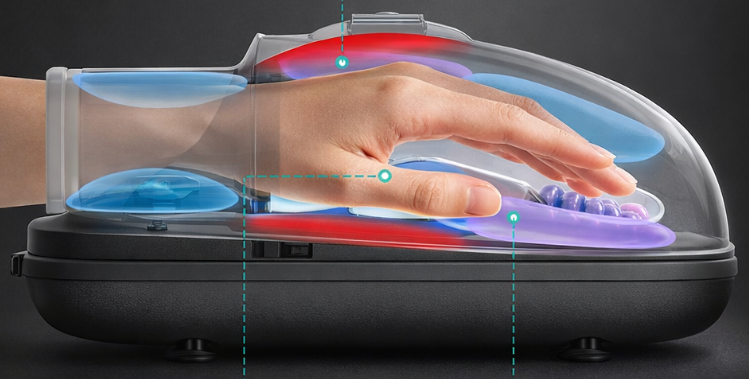 Upper and lower airbags work together with targeted acupressure beads to massage every part of your hand from palm to fingertips. This deep, rhythmic pressure helps release tension, ease cramps, and restore flexibility.